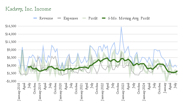 August’s revenue was $3,493, down from July’s $4,176. Profits were $942, down from July’s $2,405.