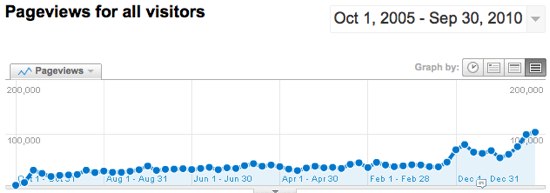 I’ve been writing on kadavy.net since May 31, 2004 – 6 years and a few months. Last month was the first month that kadavy.net reached 100,000 pageviews, which is a modest achievement, but at least I know that there are many blogs that will never reach this milestone. Even more gratifying is just looking at how traffic has grown over the years (Google Analytics has only been available since November of 2005).