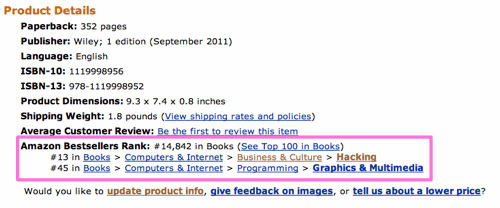 So, I’m shooting for a good Amazon rank. Things have been going well so far. I haven’t really actively asked anyone to buy my book yet, and it’s already an “Amazon bestseller,” ranking as highly as #13 in the “Hacking” sub-sub-category.