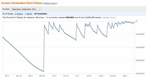 As you’ve probably figured out by now, Amazon updates their sales rankings pretty rapidly. So, the more people who buy today, the higher the ranking for Design for Hackers will be.