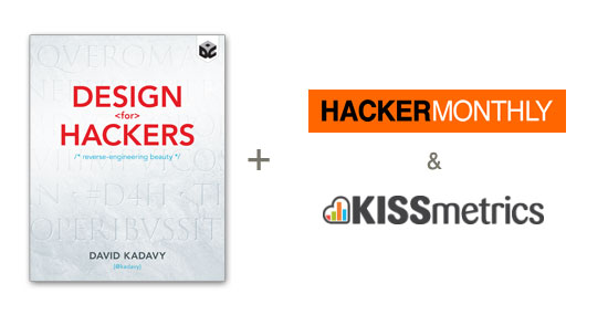 - 10 books: get the Hacker Monthly & KISSmetrics subscriptions, plus a 2-minute, publicly posted design consultation screencast. This will be just like the ones I did for my Kickstarter backers. Forward your Amazon receipt to 10books@designforhackers.com