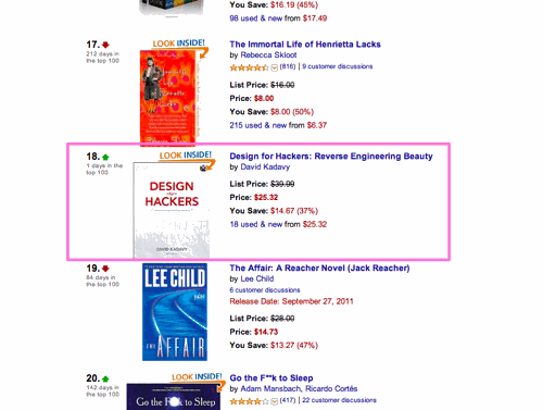 UPDATE (4:33pm CST): I just realized that Design for Hackers is now #36 #22 #18 on ALL OF AMAZON (screenshot below for posterity). Wow, I am so blown away – I never expected this. Thank you. -David