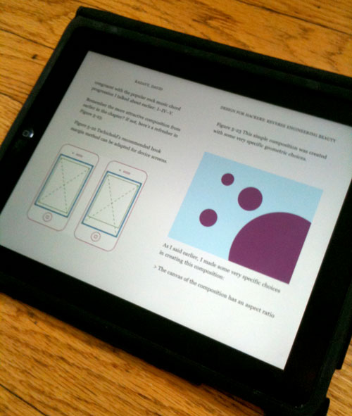 So, if you’ve been waiting for the Kindle version, or wondering if it would be any good – I’d have to say that this book could still be extremely useful this way. You could do the majority of reading on the Kindle itself, and supplement with CloudReader, iPhone, or iPad for color examples. I know how much lugging around extra stuff sucks. You can start reading Design for Hackers in minutes if you wish.