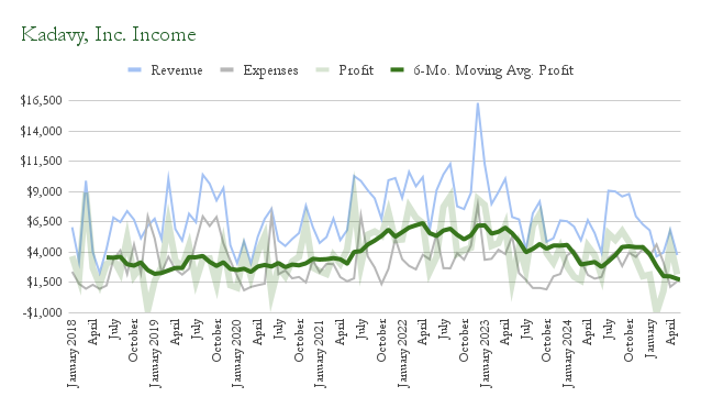May’s revenue was $3,771, down from April’s $5,797. Profits were $2,173, down from April’s $4,653.