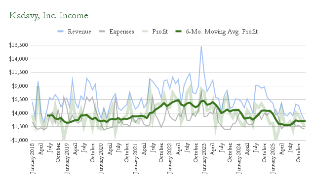 December’s revenue was $2,677, down from November’s $3,823. Profits were $1,575, down from November’s $2,541.