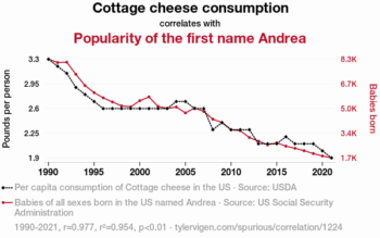 One is ad-hoc analysis. You didn’t form a hypothesis before going to Tokyo whether you’d run into Travis. A lot of other surprising things could have happened. Scientists run into problems when they look for patterns in large data sets, finding surprising things such as that as cottage cheese sales decline, so do babies named Andrea.