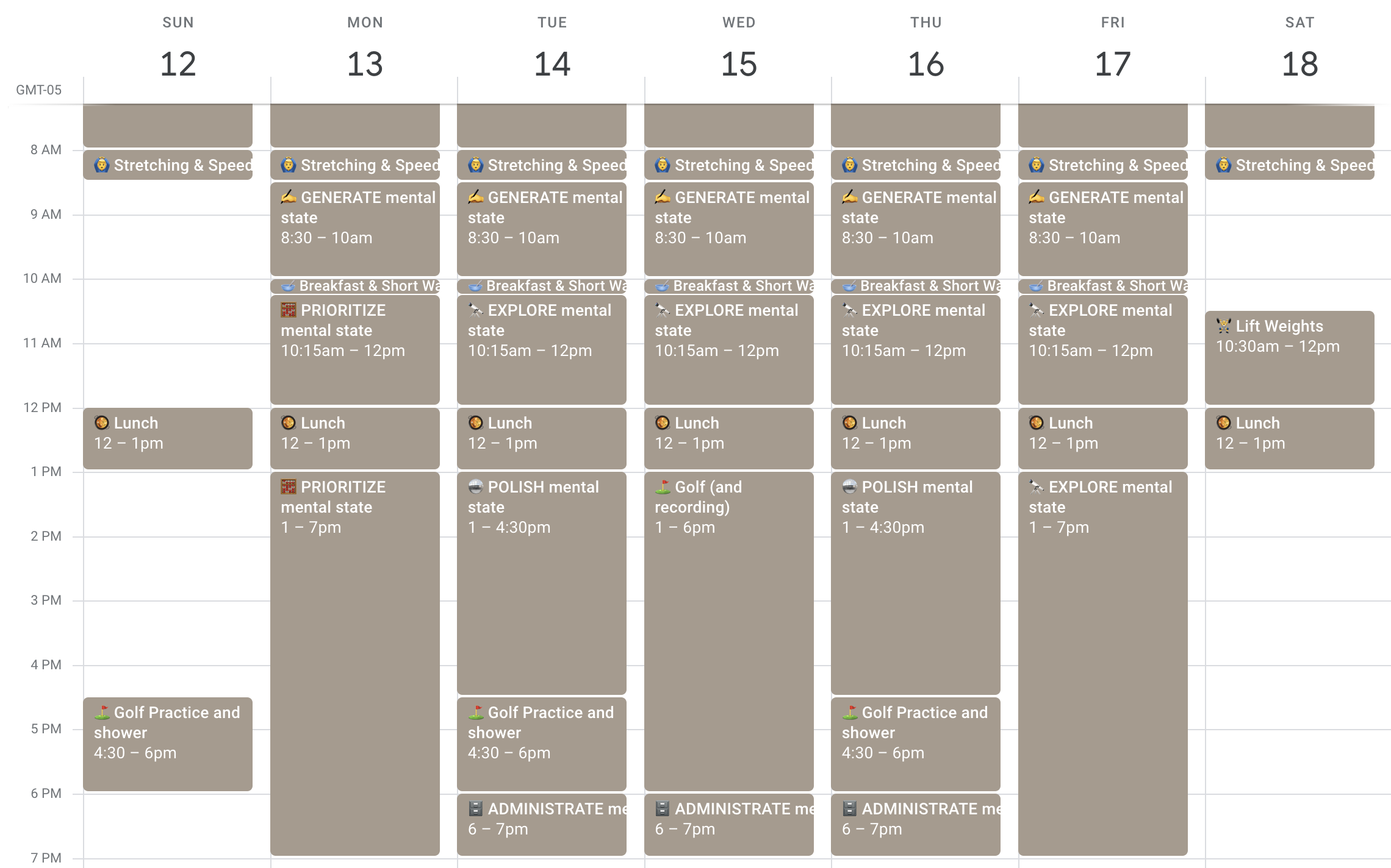 Notice my ideal week incorporates Prefrontal Mondays that keep me in the “Prioritize” mental state I talked about in Mind Management, Not Time Management. But as the week wears on, I start developing and preparing to ship ideas with the Explore, Generate, and Polish mental states.