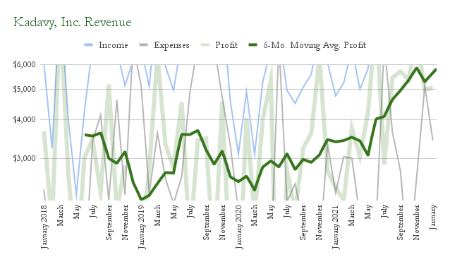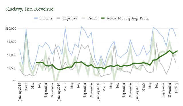 Record revenue doesn’t always mean record profit, but for the past eight months, it has. My profits over the twelve months leading up to the end of January have been $58,533. I previously reported that I had broken the $60,000 mark, but it turned out I had an error in my spreadsheet. So, I’m still a little shy of making “as much as a teacher.”