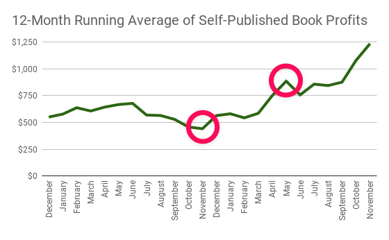 I started this streak in June, with twelve-month profits of $19,814. This is massive growth of 77% in self-published book profits, over that period of time.