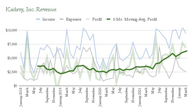 March’s income was $9,449, down from February’s $10,637. Profits were $6,859, down from February’s $7,759.