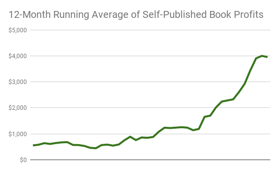 - An 11-month streak in twelve-month average self-published book profit. The streak started at $1,651, and peaked last month at $4,002. This month, it’s $3,957.