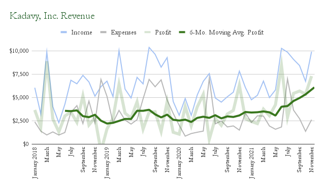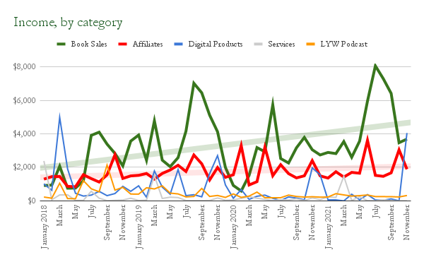 In November, I also set another twelve-month profit record for my most-important category: Self-published books. This isn’t a streak, as I barely failed to break the record in October, making that the only month in the past six that I haven’t broken the record.